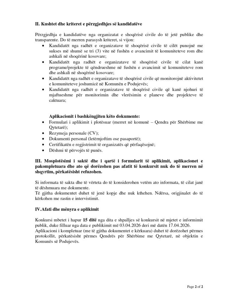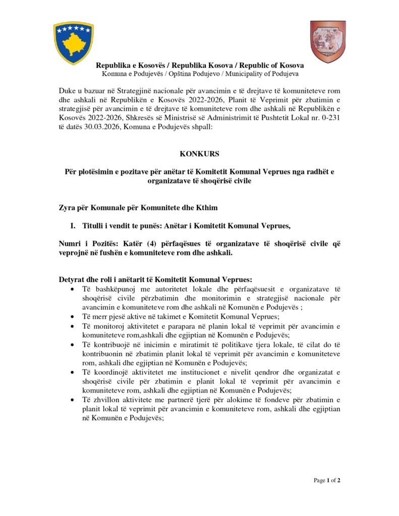 Anëtar i Komitetit Komunal Veprues Podujevë 04/17/2026 Me orar të plotë Apply Now Apply for this job Email * Gjinia Te dy gjinitë Femër Mashkull Lokacioni Ferizaj Fushë Kosovë Gjakovë Gjilan Kamenicë Lipjan London Los Angeles Malishevë Miami Mitrovicë New York Paris Pejë Prishtinë Prizeren Viti Vushtrri You accept our Terms and Conditions and Privacy Policy Job Description Burimi: podujeve.rks-gov.net/wp-content/uploads/2026/04/Konkurs-Zyra-per-Komunitete-dhe-Kthim.pdf Share this post Facebook LinkedIn Related Jobs Zyrtar për çështjet e kuvendit të komunës Istog Me orar të plotë Udhëheqës i Ekipit të Likuidimit Me orar të plotë Zyrtar për Teknologji Informative Gjakovë Me orar të plotë Farmacist Gjakovë Me orar të plotë