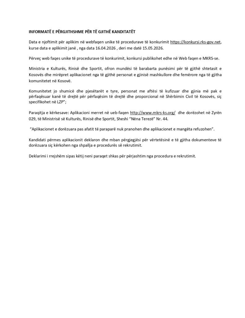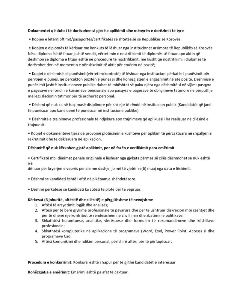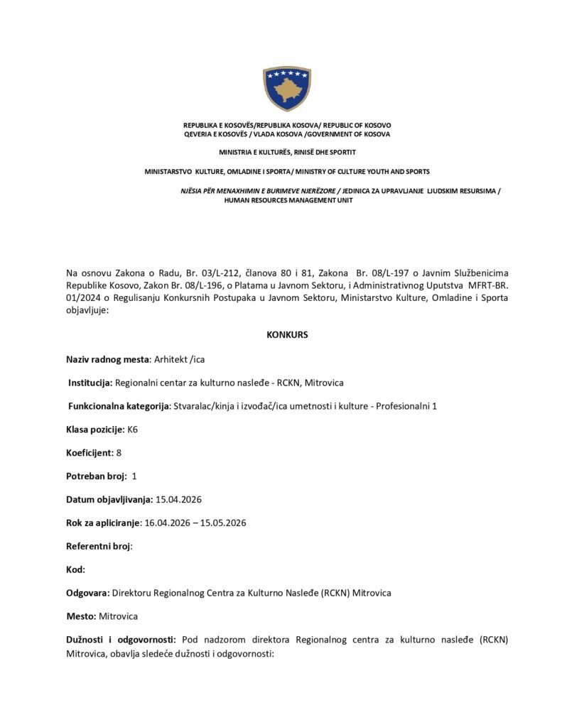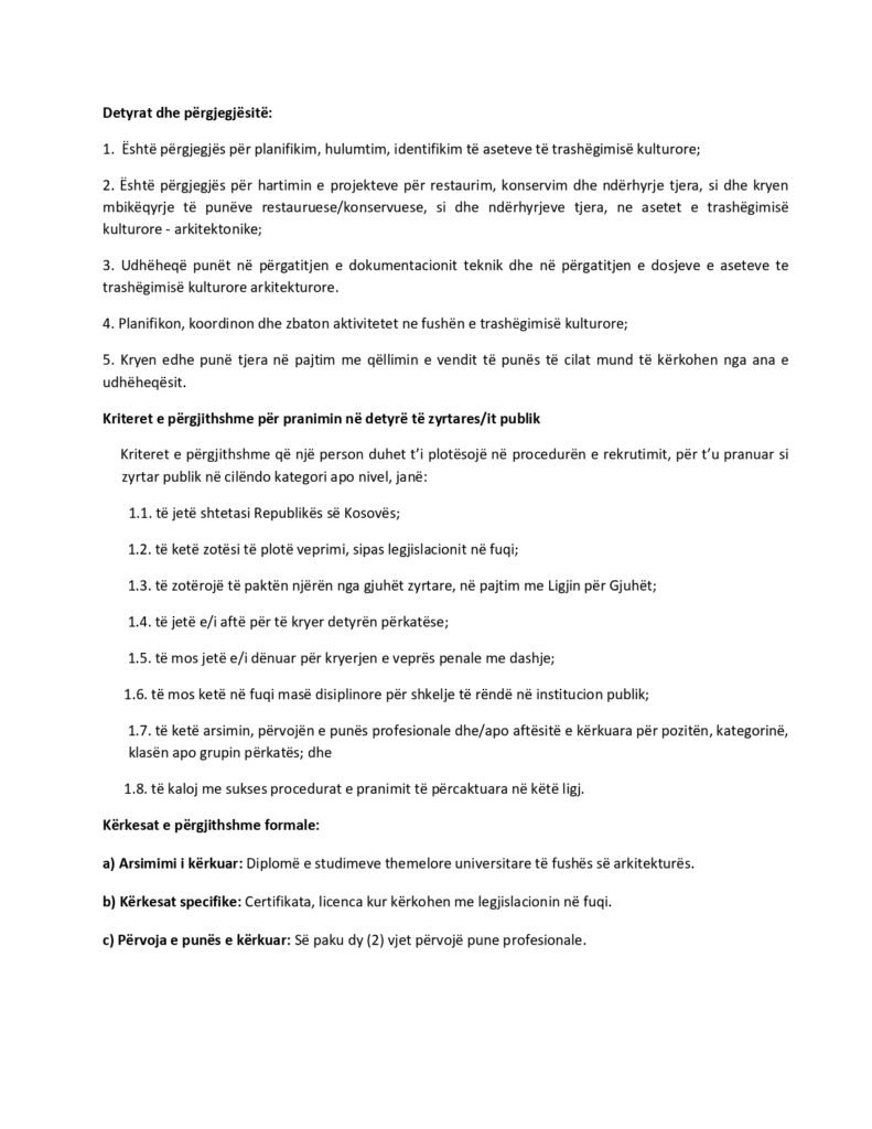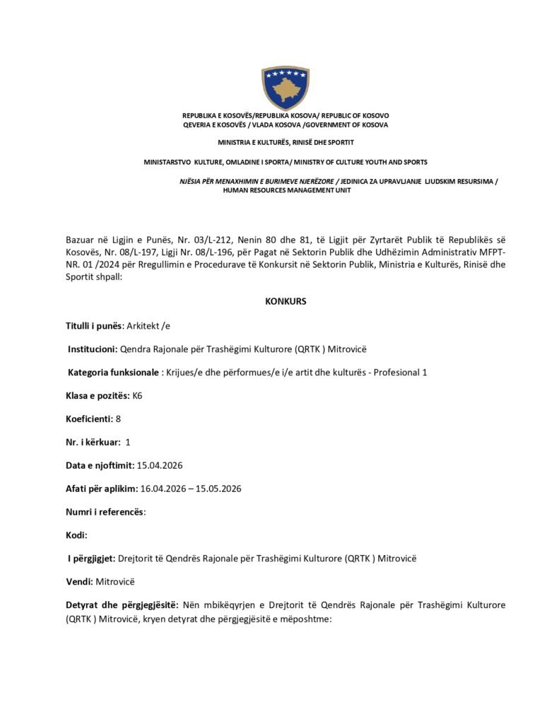 Arkitekt /e në Qendrën Rajonale për Trashëgimi Kulturore (QRTK) Mitrovicë Mitrovicë 04/16/2026 Me orar të plotë Apply Now Apply for this job Email * Gjinia Te dy gjinitë Femër Mashkull Lokacioni Ferizaj Fushë Kosovë Gjakovë Gjilan Kamenicë Lipjan London Los Angeles Malishevë Miami Mitrovicë New York Paris Pejë Prishtinë Prizeren Viti Vushtrri You accept our Terms and Conditions and Privacy Policy Job Description Burimi:konkursi.rks-gov.net/advertisement/details?refNumber=RN00019578 Share this post Facebook LinkedIn Related Jobs Instumentist – Violoncelist- Udhëheqës në Filharmoninë e Kosovës në dy gjuhë Me orar të plotë Mesimdhenes per mesim klasor Kaçanik Me orar të plotë Udheheqes/e i/e sektorit per buxhet dhe financa Prishtinë Me orar të plotë Konkurs për Pranim, pozita Zyrtar për Teknologji Informative Gjakovë Me orar të plotë
