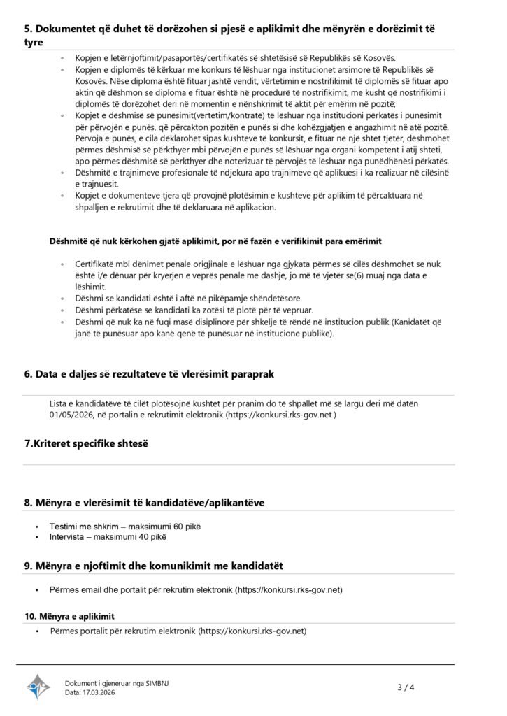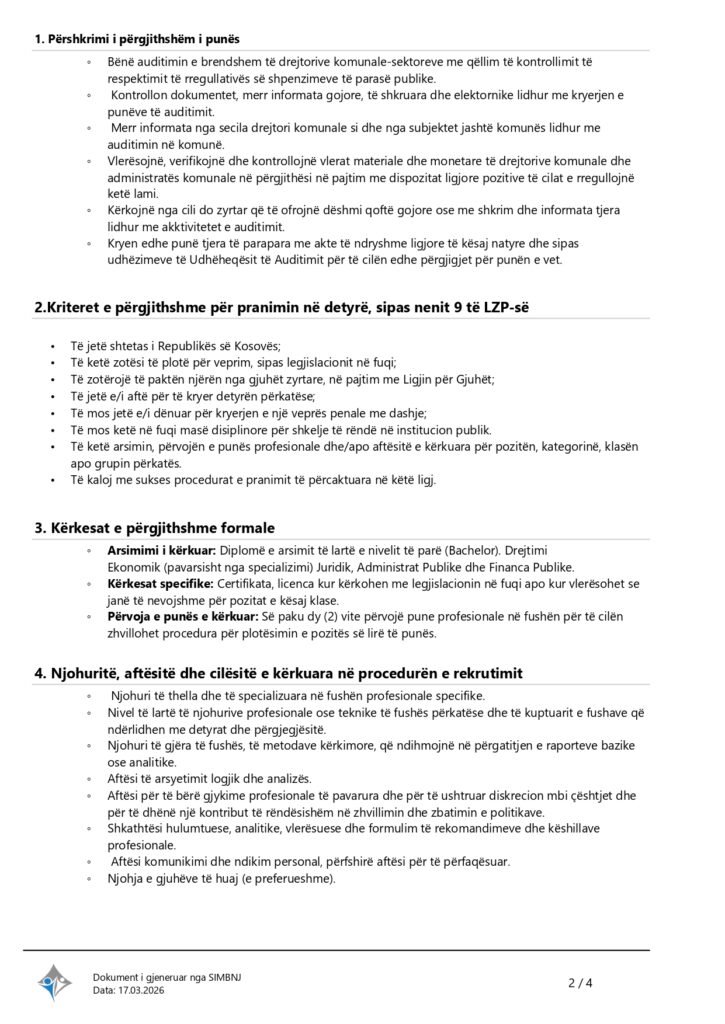 Auditor i Brendshëm Shërbyes Civil Pejë 04/13/2026 Me orar të plotë Apply Now Apply for this job Email * Gjinia Te dy gjinitë Femër Mashkull Lokacioni Ferizaj Fushë Kosovë Gjakovë Gjilan Kamenicë Lipjan London Los Angeles Malishevë Miami Mitrovicë New York Paris Pejë Prishtinë Prizeren Viti Vushtrri You accept our Terms and Conditions and Privacy Policy Job Description Burimi : Sistemi Informativ për Menaxhimin e Burimeve Njerëzore Share this post Facebook LinkedIn Related Jobs Asistent administrativ Shërbyes Civil Obiliq Me orar të plotë Zyrtar për Bujqësi Shërbyes Civil Istog Me orar të plotë Inspektor i Minierave Shërbyes Civil Prishtinë Me orar të plotë Zyrtar për biblioteka Shërbyes Civil Lipjan Me orar të plotë