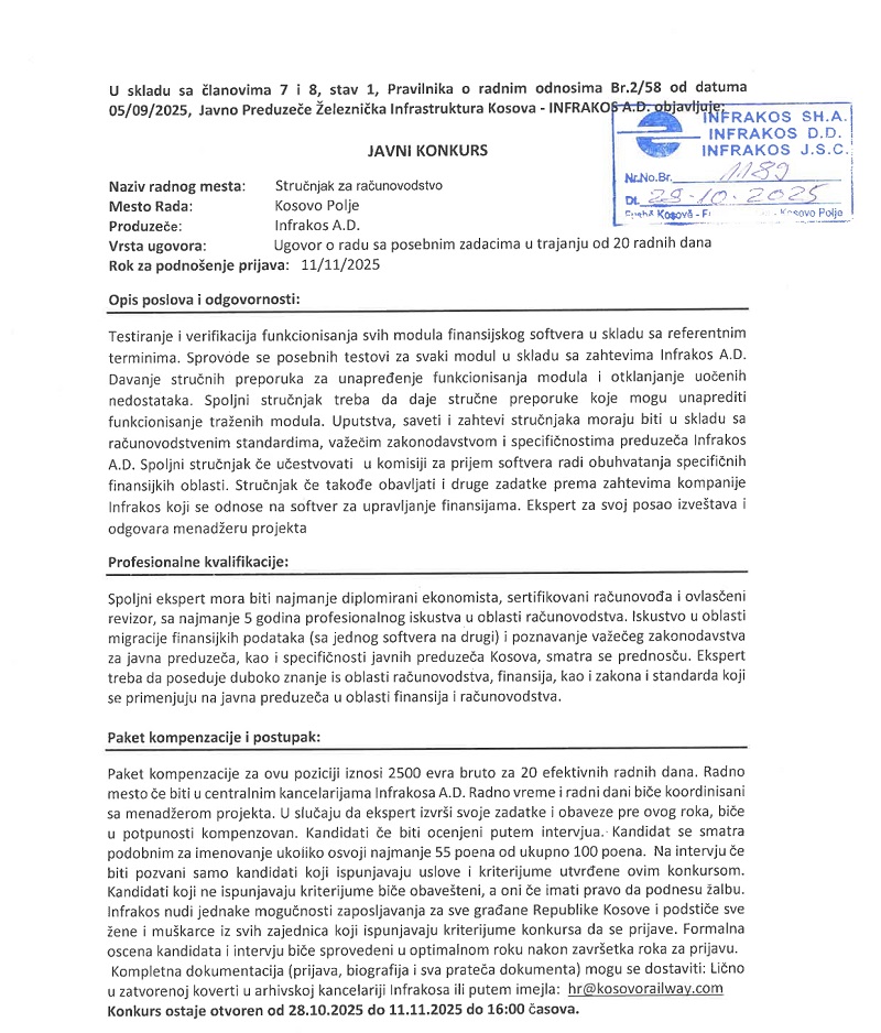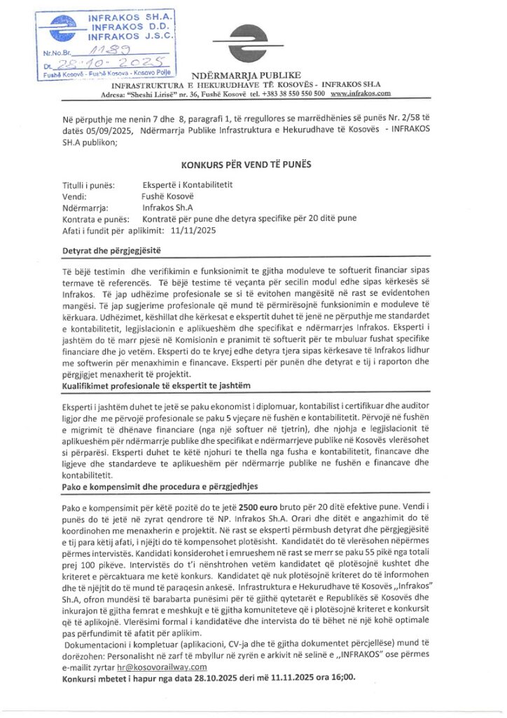 Ekspert i Kontabilitetit Kontabilitet / Financa Fushë Kosovë 10/31/2025 Orar të plotë Application ends: 11/11/2025 Apply Now Job Description Apliko këtu: hr@kosovorailway.com Burimi: https://infrakos.com/publikimet/punesimi/ Share this post Facebook LinkedIn