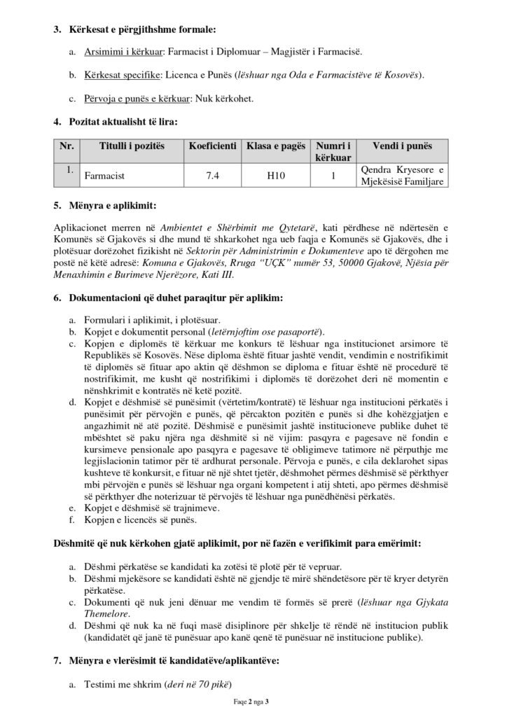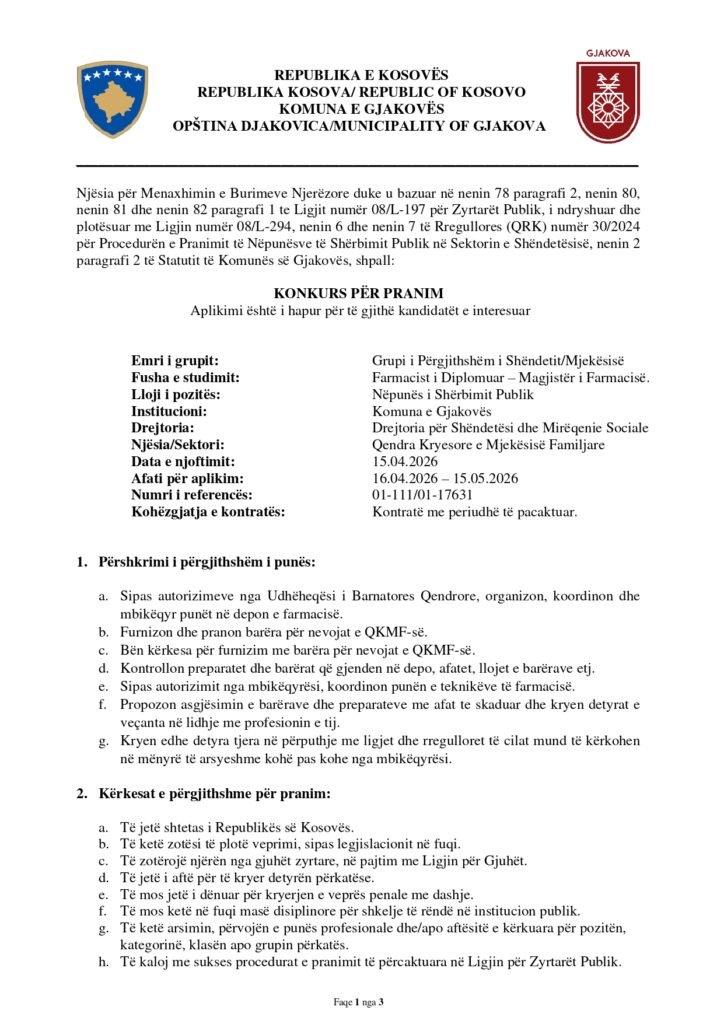 Farmacist Gjakovë 04/17/2026 Me orar të plotë Apply Now Apply for this job Email * Gjinia Te dy gjinitë Femër Mashkull Lokacioni Ferizaj Fushë Kosovë Gjakovë Gjilan Kamenicë Lipjan London Los Angeles Malishevë Miami Mitrovicë New York Paris Pejë Prishtinë Prizeren Viti Vushtrri You accept our Terms and Conditions and Privacy Policy Job Description Burimi: Share this post Facebook LinkedIn Related Jobs Zyrtar për çështjet e kuvendit të komunës Istog Me orar të plotë Udhëheqës i Ekipit të Likuidimit Me orar të plotë Anëtar i Komitetit Komunal Veprues Podujevë Me orar të plotë Zyrtar për Teknologji Informative Gjakovë Me orar të plotë