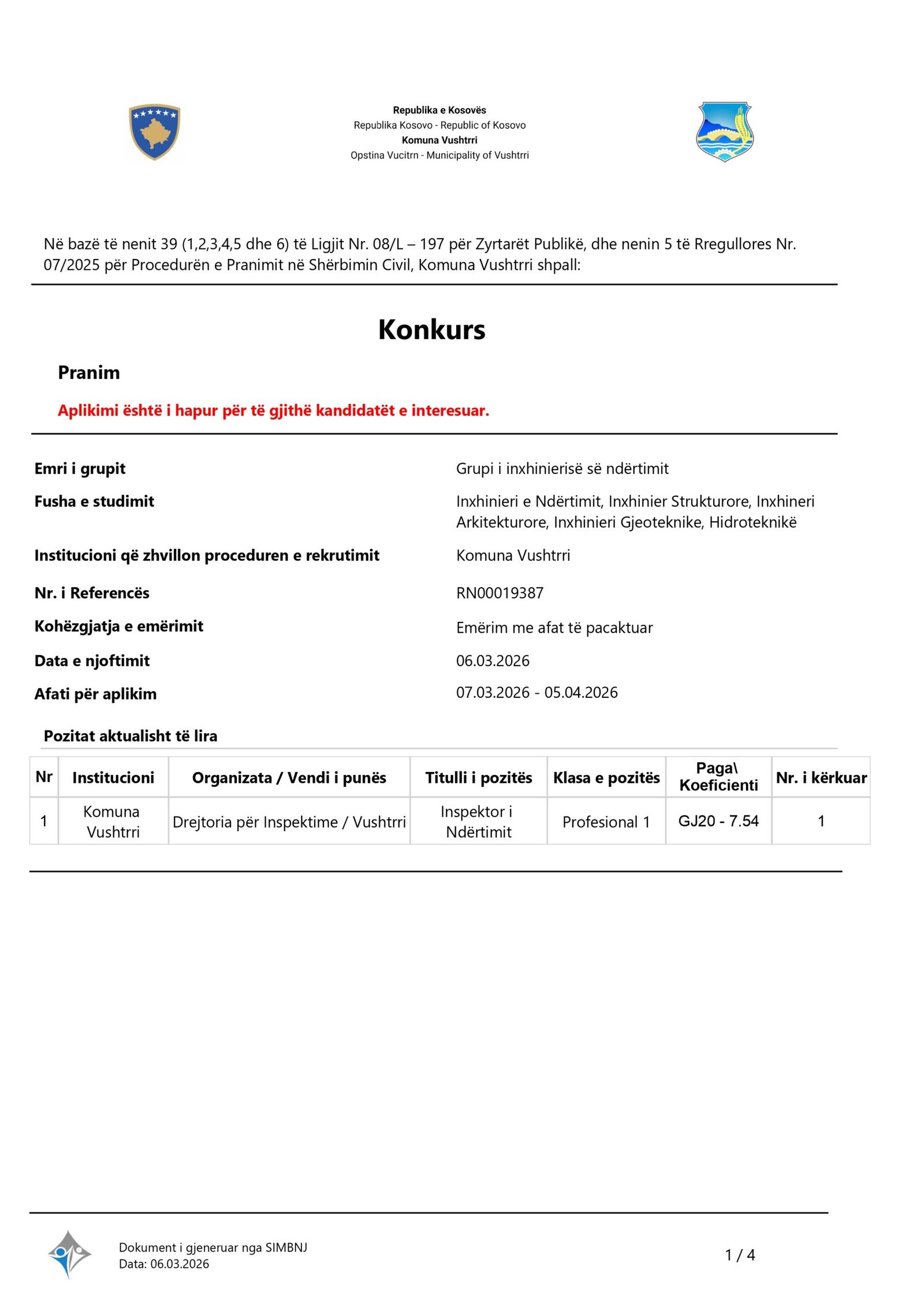 Inspektor i Ndërtimit Vushtrri 03/15/2026 Application ends: 04/05/2026 Apply Now Apply for this job Email * Gjinia Te dy gjinitë Femër Mashkull Lokacioni Ferizaj Fushë Kosovë Gjakovë Gjilan Kamenicë Lipjan London Los Angeles Malishevë Miami Mitrovicë New York Paris Pejë Prishtinë Prizeren Viti Vushtrri You accept our Terms and Conditions and Privacy Policy Job Description Burimi: https://konkursi.rks-gov.net/jobs?servant=1&functionalCategory=1 Share this post Facebook LinkedIn