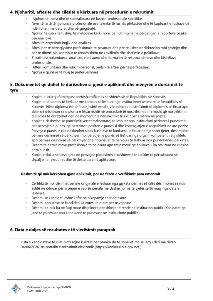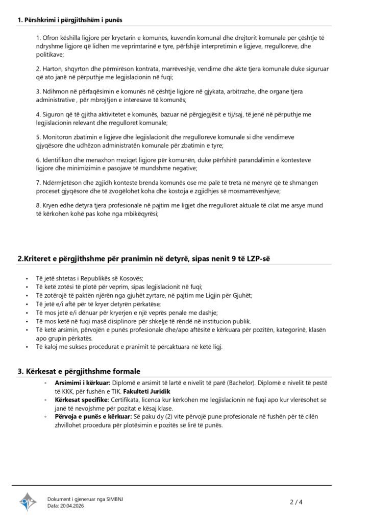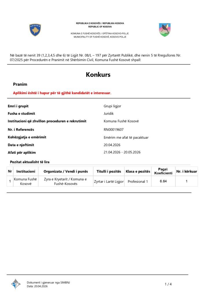 Komuna Fushë Kosovë shpall konkurs : Zyrtar i Lartë Ligjor Shërbyes Civil Fushë Kosovë 04/21/2026 Me orar të plotë Apply Now Apply for this job Email * Gjinia Te dy gjinitë Femër Mashkull Lokacioni Ferizaj Fushë Kosovë Gjakovë Gjilan Kamenicë Lipjan London Los Angeles Malishevë Miami Mitrovicë New York Paris Pejë Prishtinë Prizeren Viti Vushtrri You accept our Terms and Conditions and Privacy Policy Job Description Burimi:konkursi.rks-gov.net/advertisement/details?refNumber=RN00019607 Share this post Facebook LinkedIn Related Jobs Zyrtar i lartë për planifikim urban Shërbyes Civil Prizren Me orar të plotë Zyrtar i lartë për Tarifa Shërbyes Civil Prishtinë Me orar të plotë Inspektor i Shërbimeve Publike Shërbyes Civil Prishtinë Me orar të plotë Zyrtar për mbështetje ligjore Shërbyes Civil Hani i Elezit Me orar të plotë