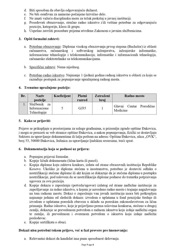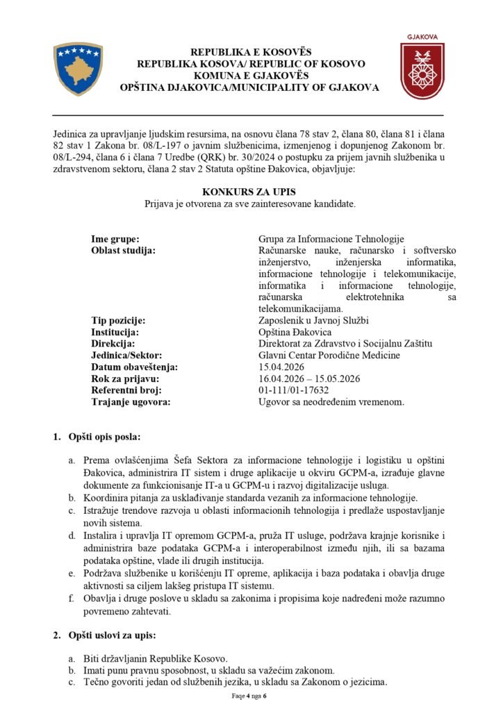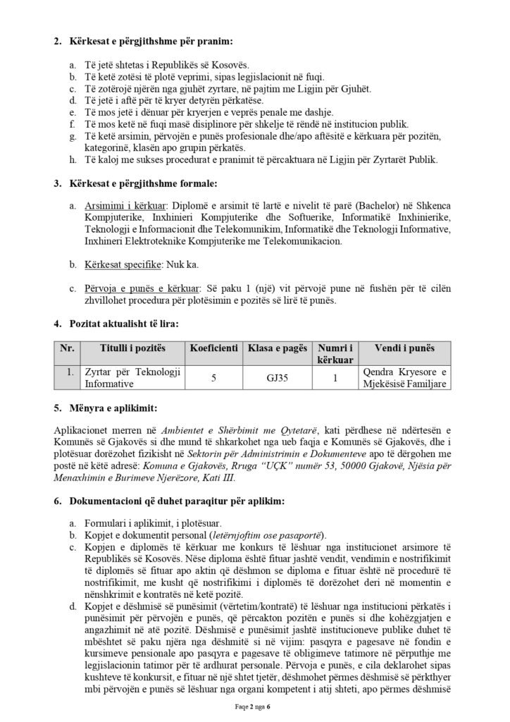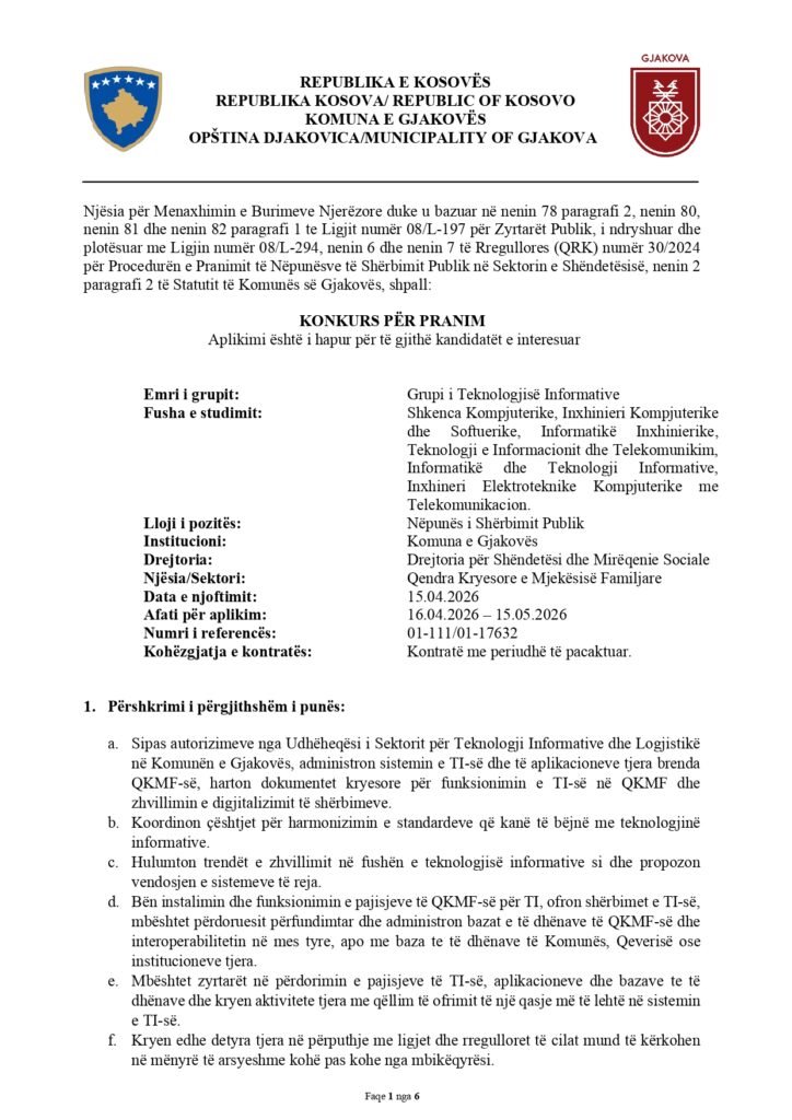 Konkurs për Pranim, pozita Zyrtar për Teknologji Informative Gjakovë 04/16/2026 Me orar të plotë Apply Now Apply for this job Email * Gjinia Te dy gjinitë Femër Mashkull Lokacioni Ferizaj Fushë Kosovë Gjakovë Gjilan Kamenicë Lipjan London Los Angeles Malishevë Miami Mitrovicë New York Paris Pejë Prishtinë Prizeren Viti Vushtrri You accept our Terms and Conditions and Privacy Policy Job Description Burimi:konkursi.rks-gov.net/advertisement/details?refNumber=RN00019577 Share this post Facebook LinkedIn Related Jobs Instumentist – Violoncelist- Udhëheqës në Filharmoninë e Kosovës në dy gjuhë Me orar të plotë Mesimdhenes per mesim klasor Kaçanik Me orar të plotë Udheheqes/e i/e sektorit per buxhet dhe financa Prishtinë Me orar të plotë Zyrtar/e për Rregullativë dhe Standardizim Prishtinë Me orar të plotë