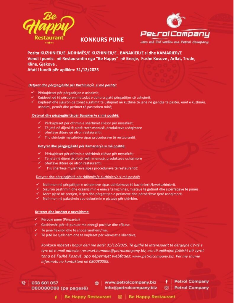KUZHINIER/E, NDIHMËS/E KUZHINIER/E, BANAKIER/E si dhe KAMARIER/E
