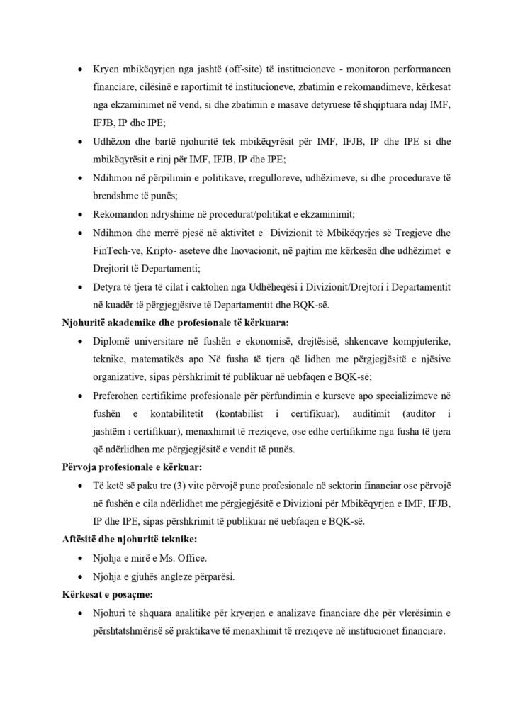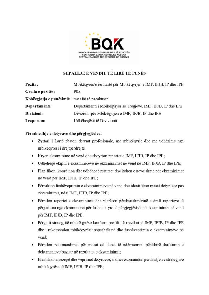 Mbikëqyrës/e i/e Lartë për Mbikëqyrjen e IMF, IFJB, IP dhe IPE Prishtinë 04/17/2026 Me orar të plotë Apply Now Apply for this job Email * Gjinia Te dy gjinitë Femër Mashkull Lokacioni Ferizaj Fushë Kosovë Gjakovë Gjilan Kamenicë Lipjan London Los Angeles Malishevë Miami Mitrovicë New York Paris Pejë Prishtinë Prizeren Viti Vushtrri You accept our Terms and Conditions and Privacy Policy Job Description Burimi:bqk-kos.org/wp-content/uploads/2026/03/Konkurs-_Mbikeqyres-i-larte-i-per-IMF-IFJB-IP-dhe-IPE.pdf Share this post Facebook LinkedIn Related Jobs Zyrtar për çështjet e kuvendit të komunës Istog Me orar të plotë Udhëheqës i Ekipit të Likuidimit Me orar të plotë Anëtar i Komitetit Komunal Veprues Podujevë Me orar të plotë Zyrtar për Teknologji Informative Gjakovë Me orar të plotë