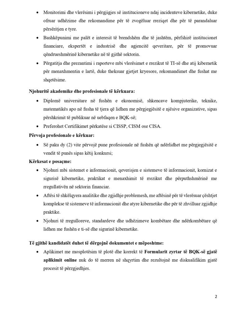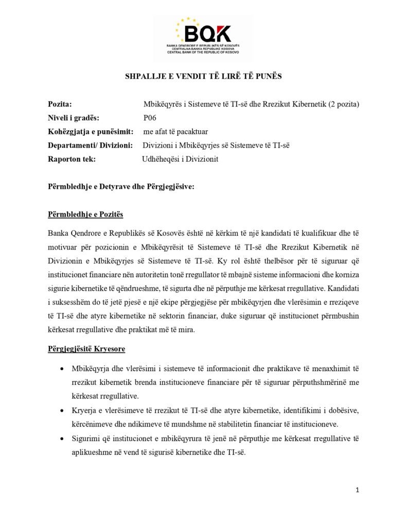 Mbikëqyrës i Sistemeve të TI-së dhe Rrezikut Kibernetik (2 pozita)