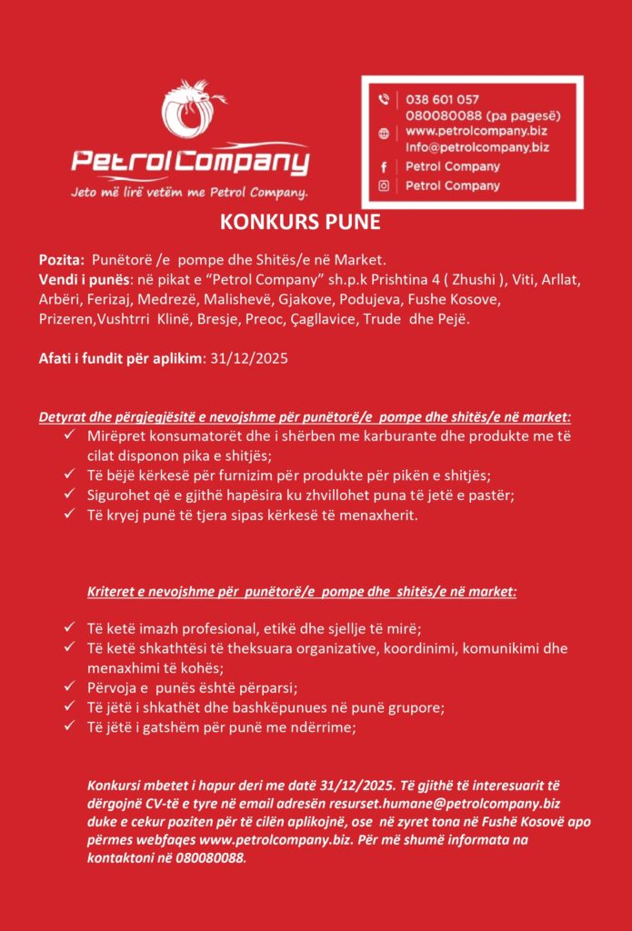 Punëtorë/e pompe dhe Shitës/e në Market Të tjera 2025-11-19 Orar të plotë Application ends: 2025-12-31 Apply Now Job Description Share this post Facebook LinkedIn Related Jobs KUZHINIER/E, NDIHMËS/E KUZHINIER/E, BANAKIER/E si dhe KAMARIER/E Të tjera Orar të plotë Shofer Mikseri dhe Bagerist Të tjera Podujevë Orar të plotë