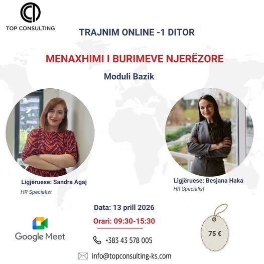 TRAJNIM ONLINE: MENAXHIMI I BURIMEVE NJERËZORE Trajnim Online - 1 ditor Kosovë 03/27/2026 Application ends: 04/12/2026 Apply Now Job Description Share this post Facebook LinkedIn