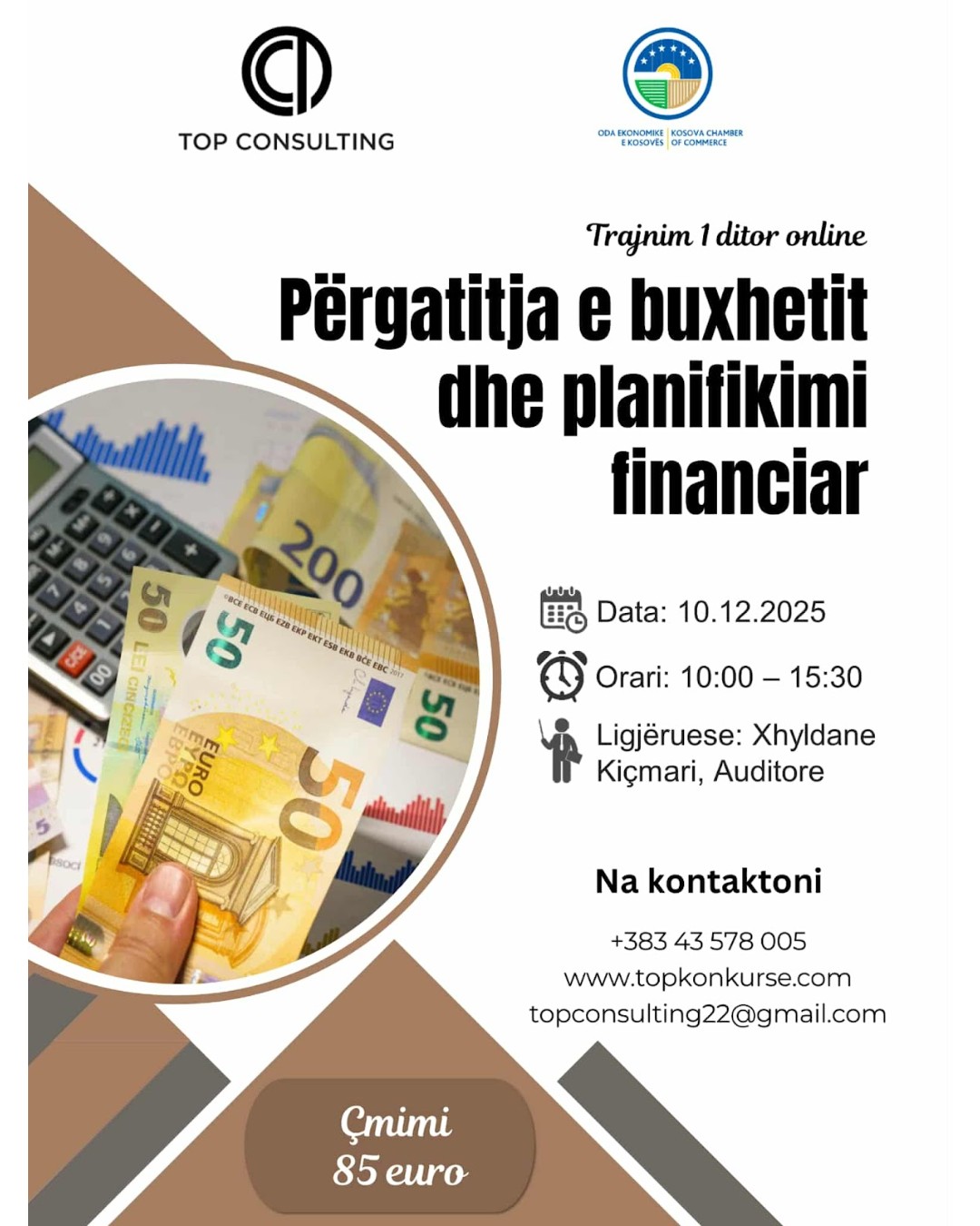 TRAJNIM ONLINE: PËRGATITJA E BUXHETIT DHE PLANFIKIMI FINANCIAR Trajnim profesional 2025-11-30 Application ends: 2025-12-09 Apply Now Job Description Linku për regjistrim: https://forms.gle/Uwpe9SSxZ61AfNV47 Kontakti: +383 43 578 005 Email: topconsulting22@gmail.com Share this post Facebook LinkedIn