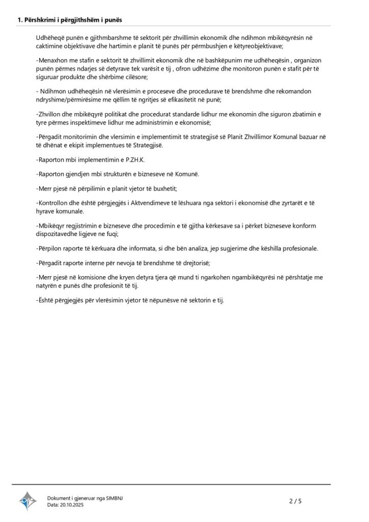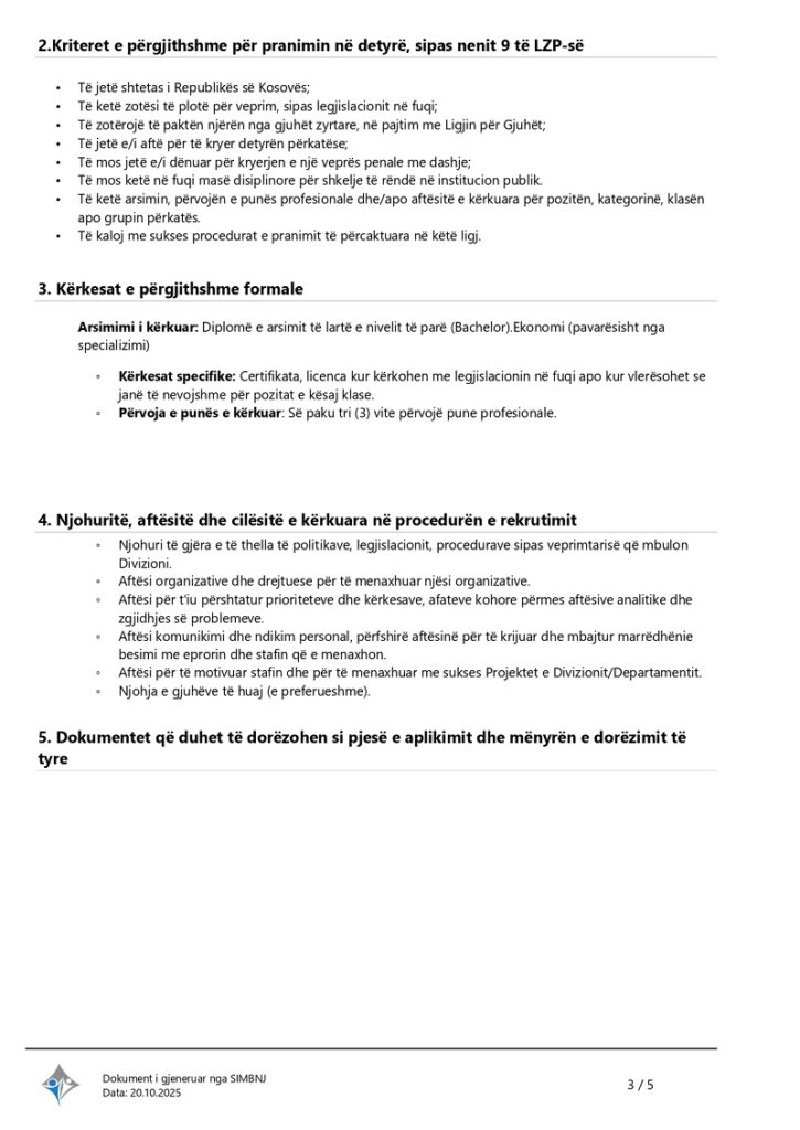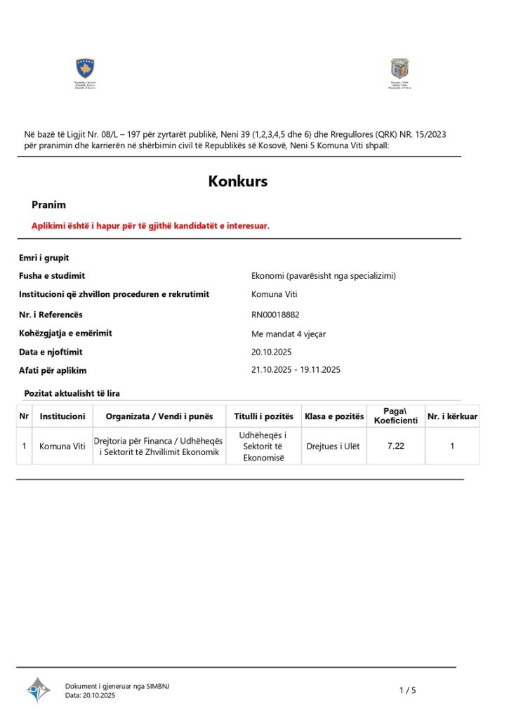 Udhëheqës i sektorit të ekonomisë Udhëheqës i Sektorit të Ekonomisë Viti 10/31/2025 Orar të plotë Application ends: 11/19/2025 Apply Now Job Description Apliko këtu: https://konkursi.rks-gov.net/jobs?servant=1 Burimi: https://konkursi.rks-gov.net/jobs?servant=1 Share this post Facebook LinkedIn