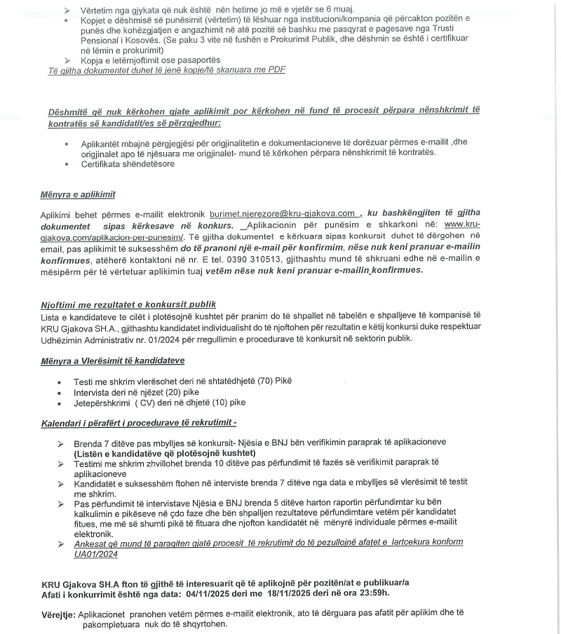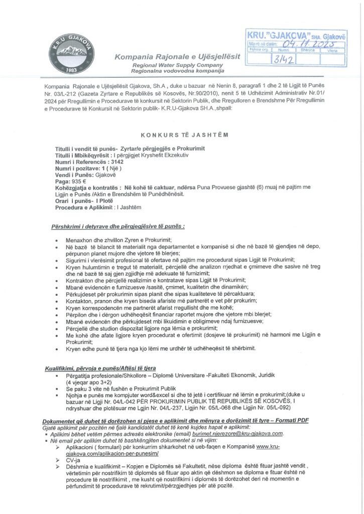 Zyrtar/e përgjegjës/e e Prokurimit Prokurim Gjakovë 11/04/2025 Orar të plotë Application ends: 11/18/2025 Apply Now Job Description Apliko këtu: burimet.njerezore@kru-gjakova.com Burimi: https://kru-gjakova.com/shpallje-konkurse/ Share this post Facebook LinkedIn