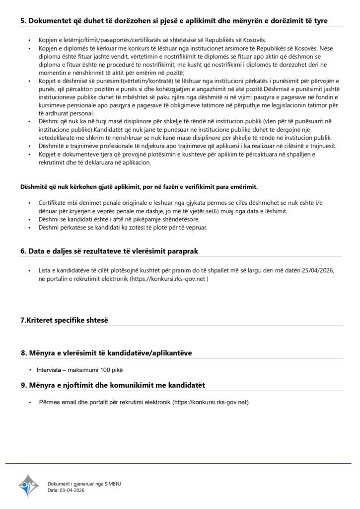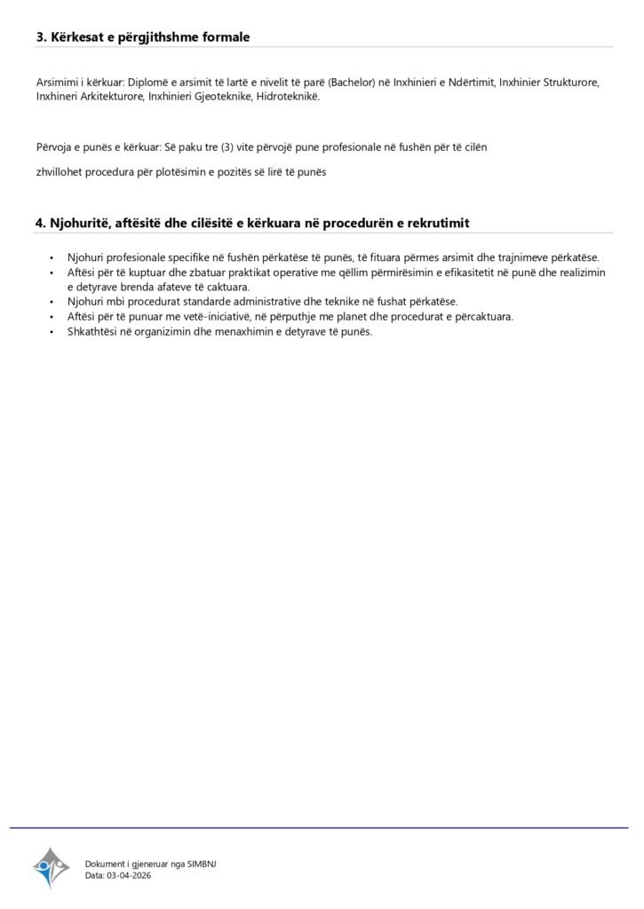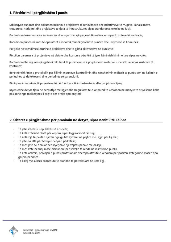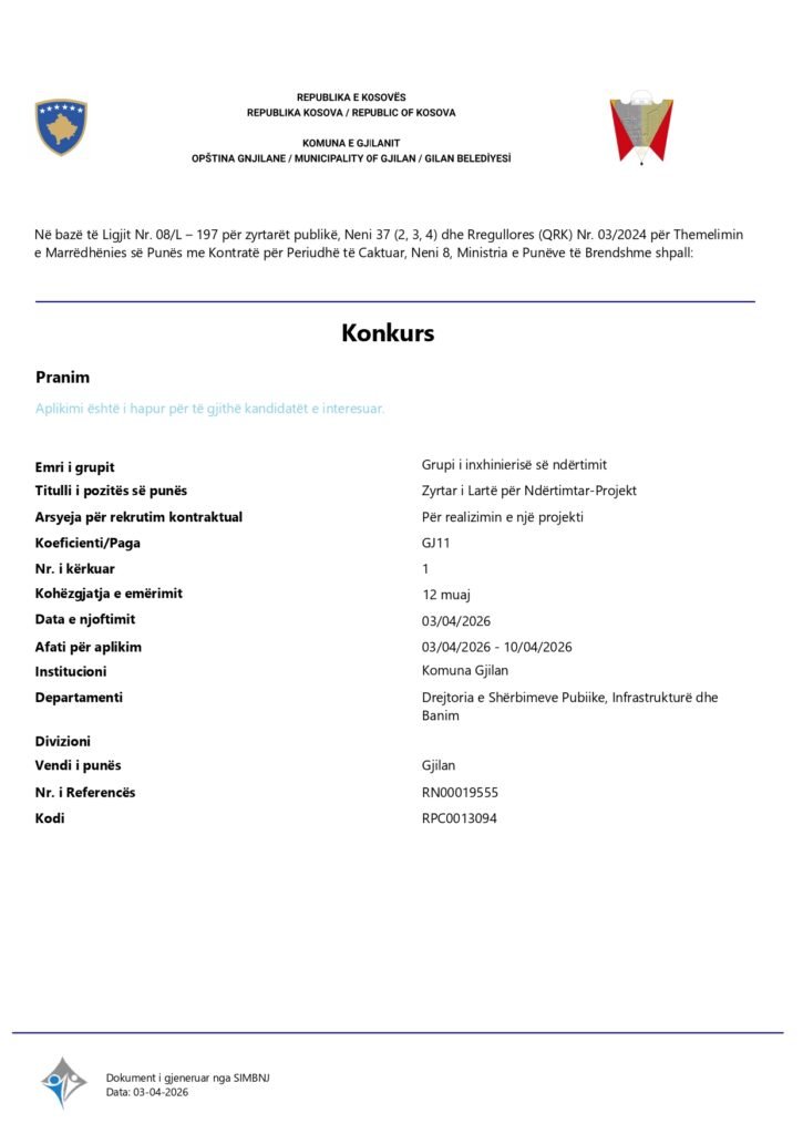 Zyrtar i Lartë për Ndërtimtar-Projekt Shërbyes me marrëdhënie kontraktuale Gjilan 04/07/2026 Me orar të plotë Apply Now Apply for this job Email * Gjinia Te dy gjinitë Femër Mashkull Lokacioni Ferizaj Fushë Kosovë Gjakovë Gjilan Kamenicë Lipjan London Los Angeles Malishevë Miami Mitrovicë New York Paris Pejë Prishtinë Prizeren Viti Vushtrri You accept our Terms and Conditions and Privacy Policy Job Description Burimi : Sistemi Informativ për Menaxhimin e Burimeve Njerëzore Share this post Facebook LinkedIn Related Jobs Asistent administrativ Shërbyes me marrëdhënie kontraktuale Gjilan Me orar të plotë