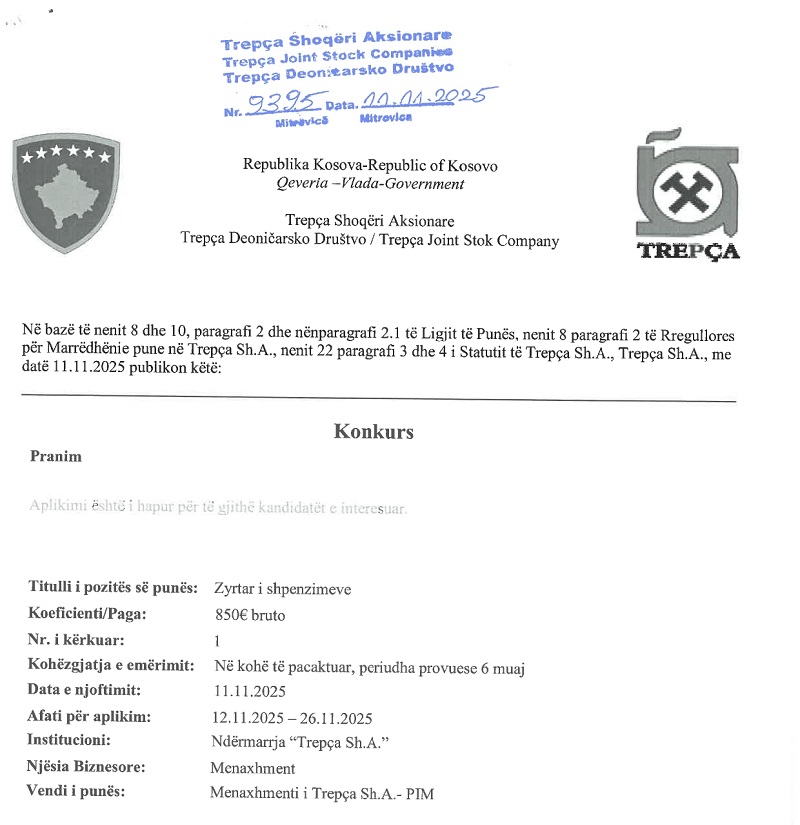Zyrtar i shpenzimeve Zyrtar i shpenzimeve Mitrovicë 11/12/2025 Orar të plotë Application ends: 11/26/2025 Job Description Apliko: https://trepcasha.com/index.php?page=announcements Burimi: https://trepcasha.com/index.php?page=announcements Share this post Facebook LinkedIn