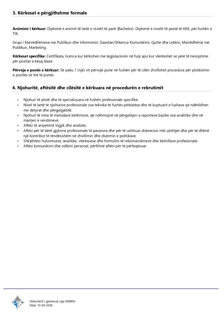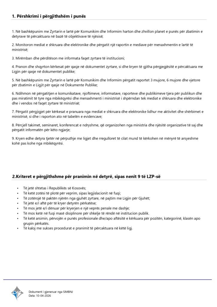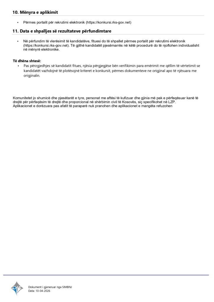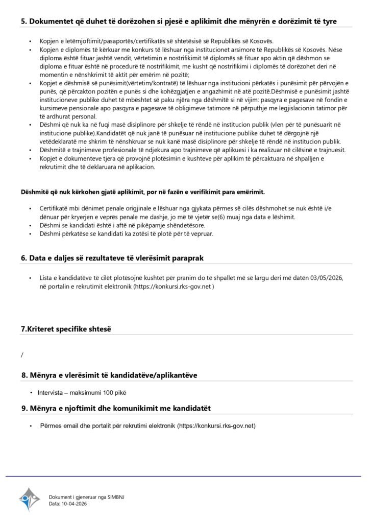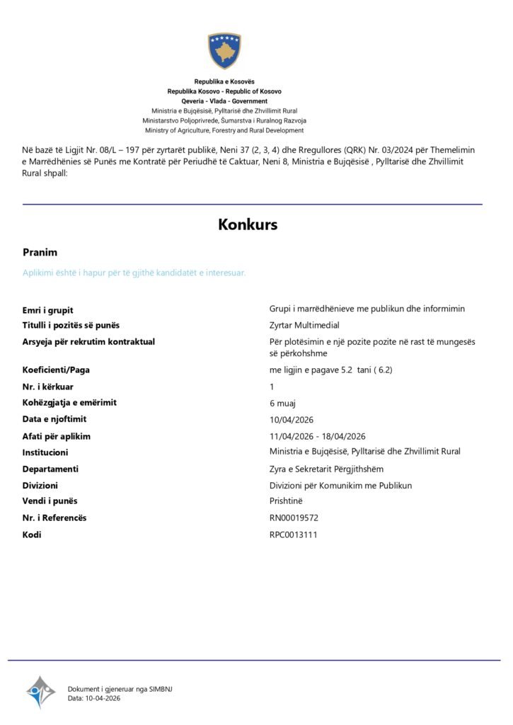 Zyrtar Multimedial Shërbyes me marrëdhënie kontraktuale Prishtinë 04/15/2026 Me orar të plotë Apply Now Apply for this job Email * Gjinia Te dy gjinitë Femër Mashkull Lokacioni Ferizaj Fushë Kosovë Gjakovë Gjilan Kamenicë Lipjan London Los Angeles Malishevë Miami Mitrovicë New York Paris Pejë Prishtinë Prizeren Viti Vushtrri You accept our Terms and Conditions and Privacy Policy Job Description Burimi: Sistemi Informativ për Menaxhimin e Burimeve Njerëzore Share this post Facebook LinkedIn Related Jobs Asistent administrativ Shërbyes me marrëdhënie kontraktuale Gjilan Me orar të plotë Zyrtar i Lartë për Ndërtimtar-Projekt Shërbyes me marrëdhënie kontraktuale Gjilan Me orar të plotë