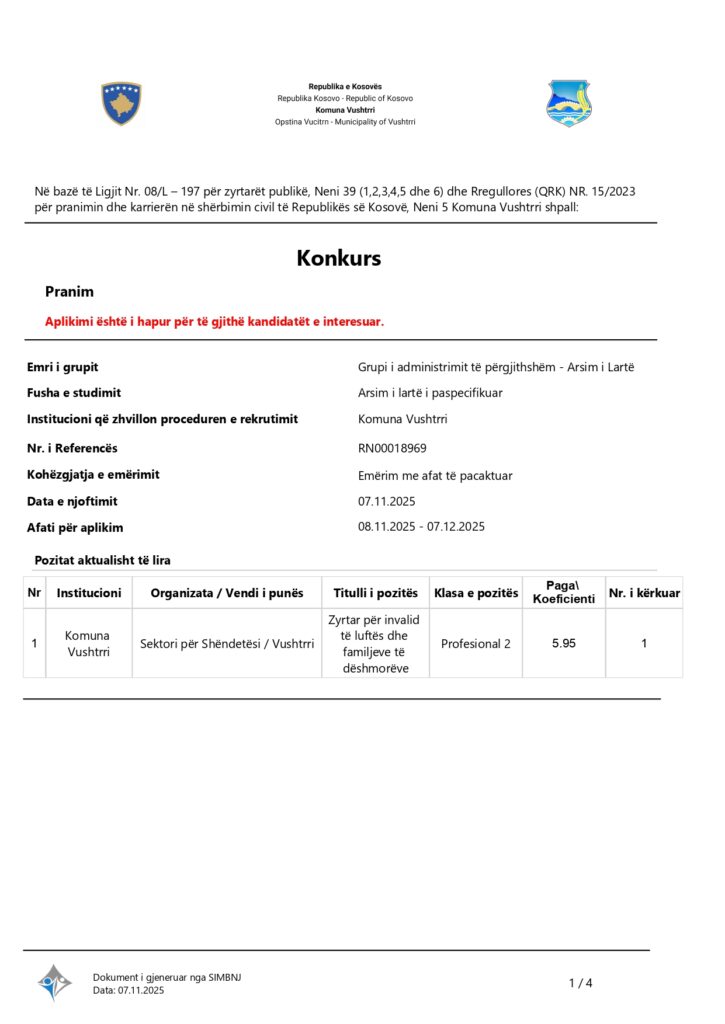 Apliko: https://konkursi.rks-gov.net/advertisement/details?refNumber=RN00018969