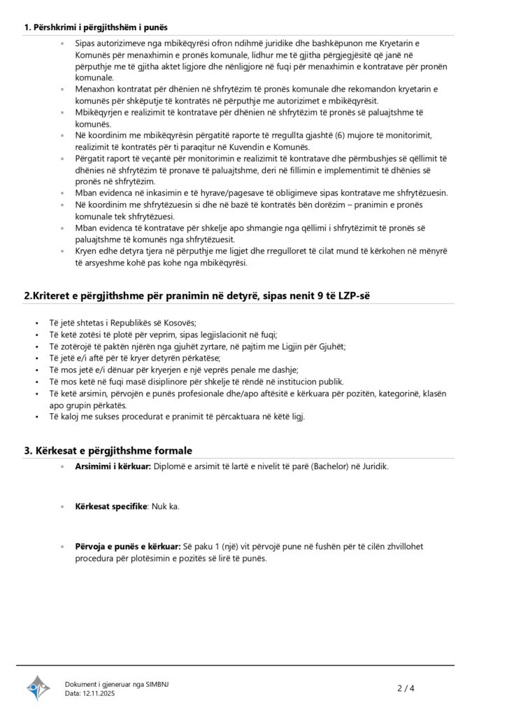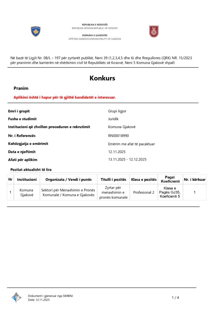 Zyrtar për menaxhimin e pronës komunale Zyrtar për menaxhimin e pronës komunale Gjakovë 11/13/2025 Orar të plotë Application ends: 12/12/2025 Apply Now Job Description Burimi: https://konkursi.rks-gov.net/advertisement/details?refNumber=RN00018990 Share this post Facebook LinkedIn
